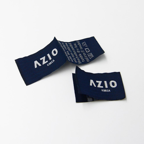 Tekstilinė etiketė sulankstyta per vidurį, pritaikyta skaitmeninėmis didelio tankio išsiuvinėtomis raidėmis.