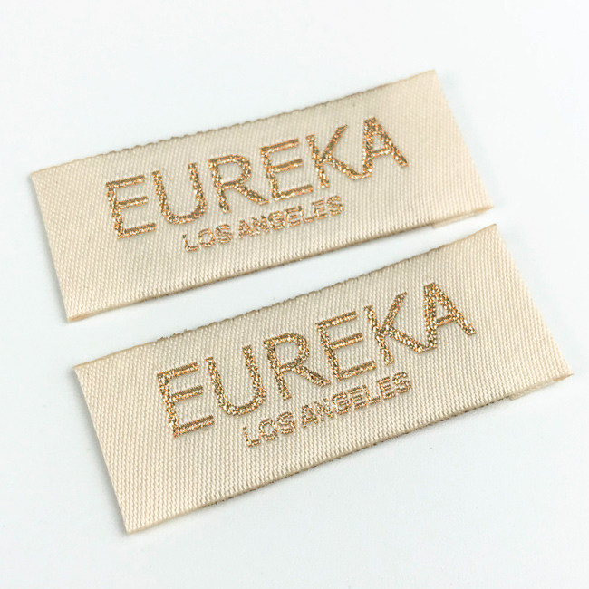 Drabužių etiketė iš damasko, austa siuvinėjimo siūlais arba lurekso siūlų modeliu WL-M10, suasmeninta prekės ženklu arba logotipu. Šio tipo austos etiketės yra pagamintos iš aukštos kokybės medžiagų, naudojant pažangiausias technologijas iš skaitmeninio siuvinėjimo srities pramoniniu lygiu.