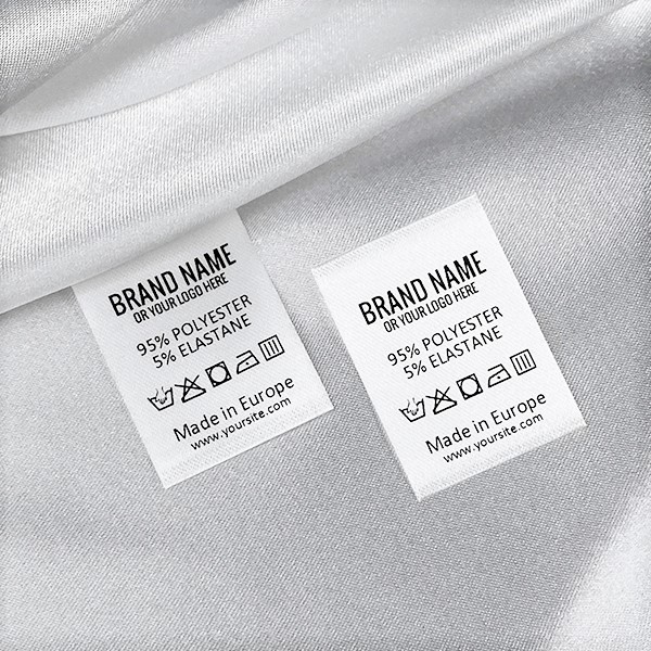 Skalbimo priežiūros etiketė, pritaikyta prekės ženklui, audinio sudėčiai, skalbimo ir priežiūros simboliams, atspausdinta ant balto satino ir ultragarsu supjaustyta kraštuose. Šio tipo tekstilės etiketės gaminamos naudojant pažangiausias technologijas skaitmeninės spaudos srityje ant tekstilės atramos. Etiketės spausdinamos ant specialaus satino terminio perdavimo būdu, pasižyminčiu įspūdinga spausdinimo kokybe ir dideliu atsparumu plovimui.