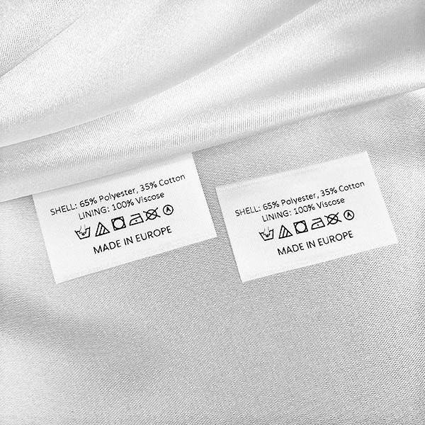 Tekstilės etiketė su skalbimo ir priežiūros simboliais bei informacija apie medžiagos sudėtį, pritaikyta smulkiam aukštos kokybės satinui, ultragarsu karštu pjūviu. Šio tipo tekstilės etiketės gaminamos naudojant pažangiausias technologijas skaitmeninės spaudos srityje ant tekstilės atramos. Etiketės spausdinamos ant specialaus satino terminio perdavimo būdu, pasižyminčiu įspūdinga spausdinimo kokybe ir dideliu atsparumu plovimui.