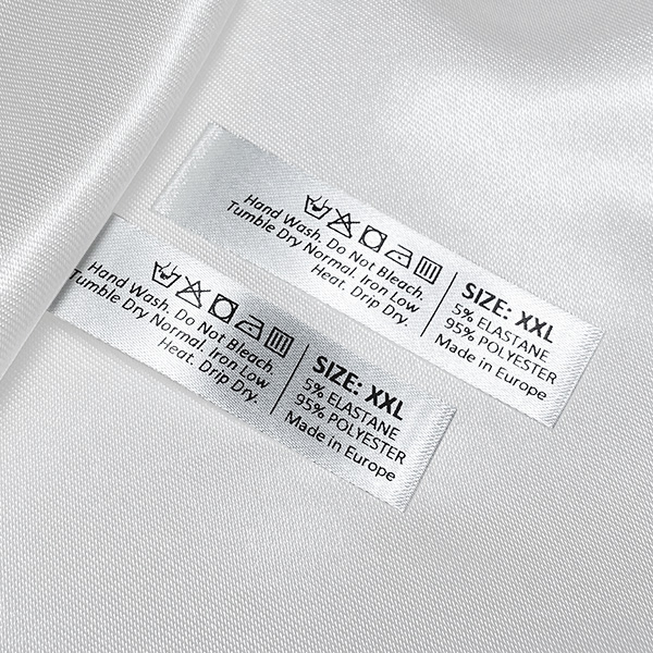 Individualizuota satino etiketė drabužių ženklinimui su priežiūros ir priežiūros informacija, įskaitant skalbimo simbolius, sudėtį ir dydžius. Šio tipo tekstilės etiketės gaminamos naudojant pažangiausias technologijas skaitmeninės spaudos srityje ant tekstilės atramos. Etiketės spausdinamos ant specialaus satino terminio perdavimo būdu, pasižyminčiu įspūdinga spausdinimo kokybe ir dideliu atsparumu plovimui.