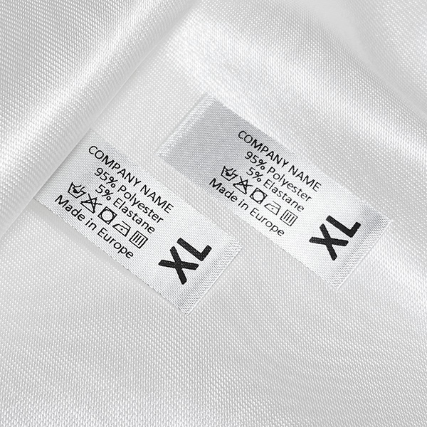 Skalbinių priežiūros ir sudėties etiketė su dydžiais ir skalbimo simboliais, pagamintais iš aukštos kokybės satino, skirta siūti ant drabužių. Šio tipo tekstilės etiketės gaminamos naudojant pažangiausias technologijas skaitmeninės spaudos srityje ant tekstilės atramos. Etiketės spausdinamos ant specialaus satino terminio perdavimo būdu, pasižyminčiu įspūdinga spausdinimo kokybe ir dideliu atsparumu plovimui.