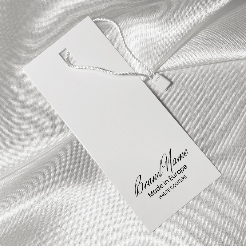 Popierinė etiketė su plastikiniu sandarikliu drabužiams ar įvairiems tekstilės gaminiams laikyti, pagaminta iš blizgaus plastifikuoto kartono, iš vienos pusės pritaikyta tekstui ir logotipui. Šio tipo pakabinimo etiketė yra pagaminta iš aukštos kokybės medžiagų, naudojant pažangiausias technologijas skaitmeninio spausdinimo ir apdailos srityje.