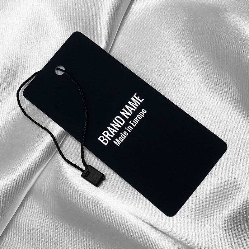 Elegantiška drabužių etiketė su kabančiu įgėlimu, pagaminta iš juodo kartono, pritaikyta sidabro tekstui ar logotipui. Šio tipo pakabinimo etiketė yra pagaminta iš aukštos kokybės medžiagų, naudojant pažangiausias technologijas skaitmeninio spausdinimo ir apdailos srityje.