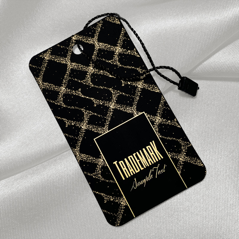 Auksinė rašymo etiketė, pagaminta iš laminuoto kartono su specialia aksomo tekstūros folija, tinkama drabužiams, drabužių aksesuarams, avalynei ir kitiems. Šio tipo pakabinimo etiketė yra pagaminta iš aukštos kokybės medžiagų, naudojant pažangiausias technologijas skaitmeninio spausdinimo ir apdailos srityje.