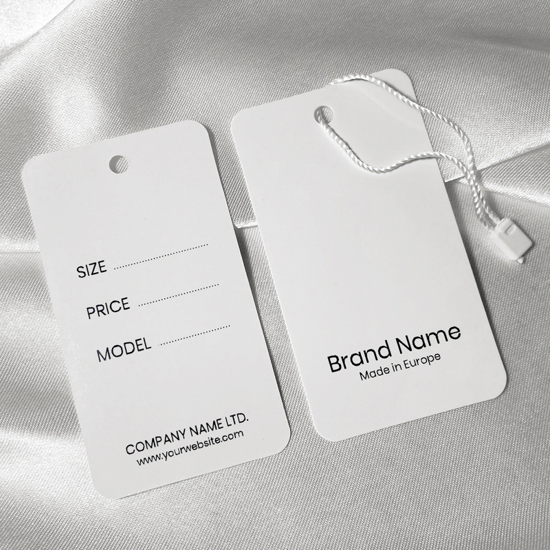 Drabužių pakabinimo etiketė, pagaminta iš storo laminuoto kartono su blizgančia folija ir suasmeninta priekinėje ir galinėje pusėje su prekės ženklo pavadinimu arba logotipu, su antspaudu su virvele, skirta pakabinti ant įvairių drabužių. Šio tipo pakabinimo etiketė yra pagaminta iš aukštos kokybės medžiagų, naudojant pažangiausias technologijas skaitmeninio spausdinimo ir apdailos srityje.