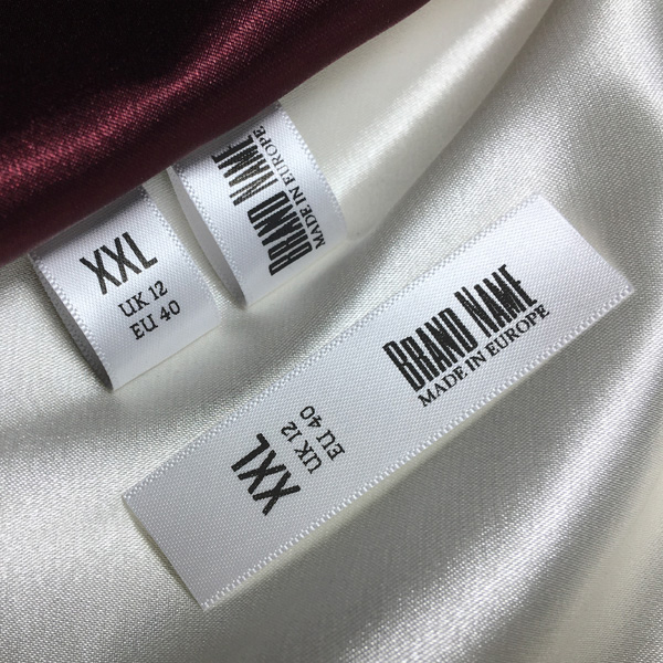 Drabužių dydžio etiketė, atspausdinta ant satino, pritaikyta prekės ženklui arba logotipui galinėje pusėje, tinkama drabužiams. Šio tipo tekstilės etiketės gaminamos naudojant pažangiausias technologijas skaitmeninės spaudos srityje ant tekstilės atramos. Etiketės spausdinamos ant specialaus satino terminio perdavimo būdu, pasižyminčiu įspūdinga spausdinimo kokybe ir dideliu atsparumu plovimui.
